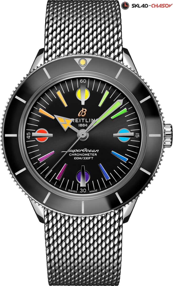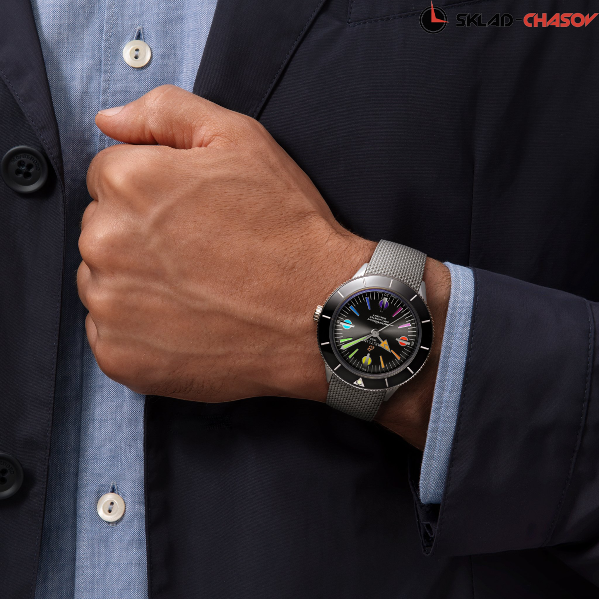 Ограниченная серия - 250 экземпляров. Модель посвящена оригинальным часам из коллекции SuperOcean 1957 года. Стильные и непринужденные, напоминающие серфингистов 60-х годов. Вогнутый двунаправленный керамический безель и циферблат с разноцветными индексами. Задняя крышка с гравировкой. COSC хронометр.