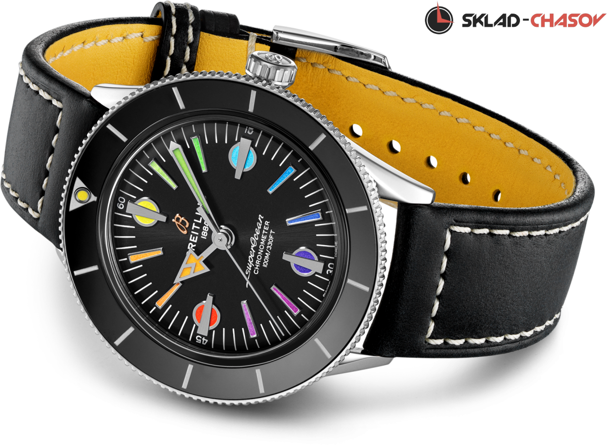 Ограниченная серия - 250 экземпляров. Модель посвящена оригинальным часам из коллекции SuperOcean 1957 года. Стильные и непринужденные, напоминающие серфингистов 60-х годов. Вогнутый двунаправленный керамический безель и циферблат с разноцветными индексами. Задняя крышка с гравировкой. COSC хронометр.