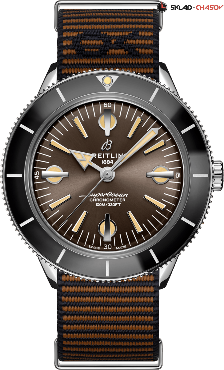 Модель посвящена оригинальным часам из коллекции SuperOcean 1957 года. Стильные и непринужденные, напоминающие серфингистов 60-х годов. Вогнутый двунаправленный керамический безель и циферблат с увеличенными индексами. Задняя крышка с гравировкой. COSC хронометр. Эти часы, ставшие результатом сотрудничества Breitling с компанией Келли Слейтера (выпускает одежду для серфингистов), комплектуются специальным ремешком Nato из волокна ECONYL®