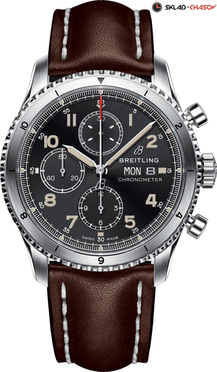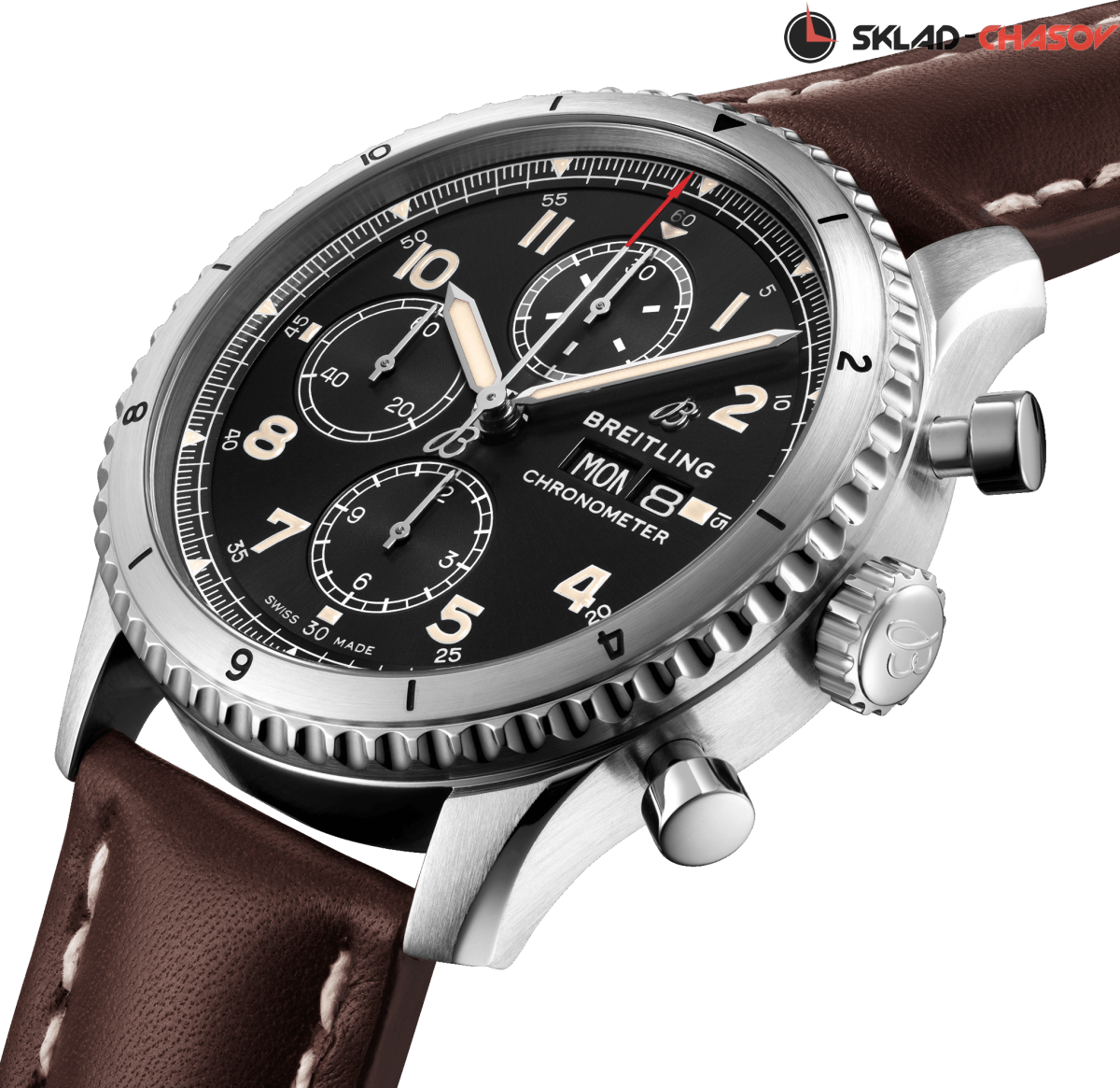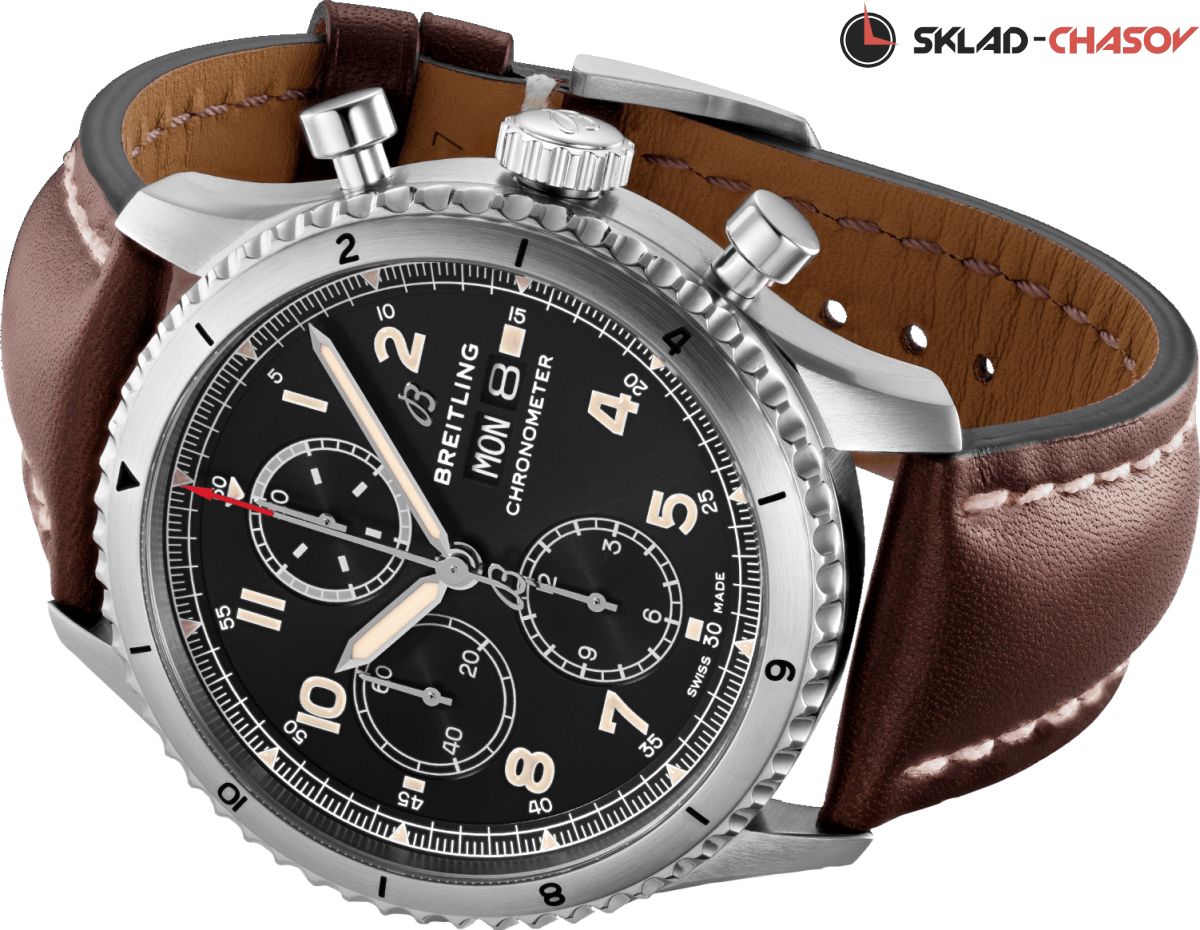 Мужской механический хронограф, индикация даты и месяца в положении 3 часа, малая секундная стрелка в положении 9 часов, двунаправленный вращающийся безель. Сертификат C.O.S.C.
