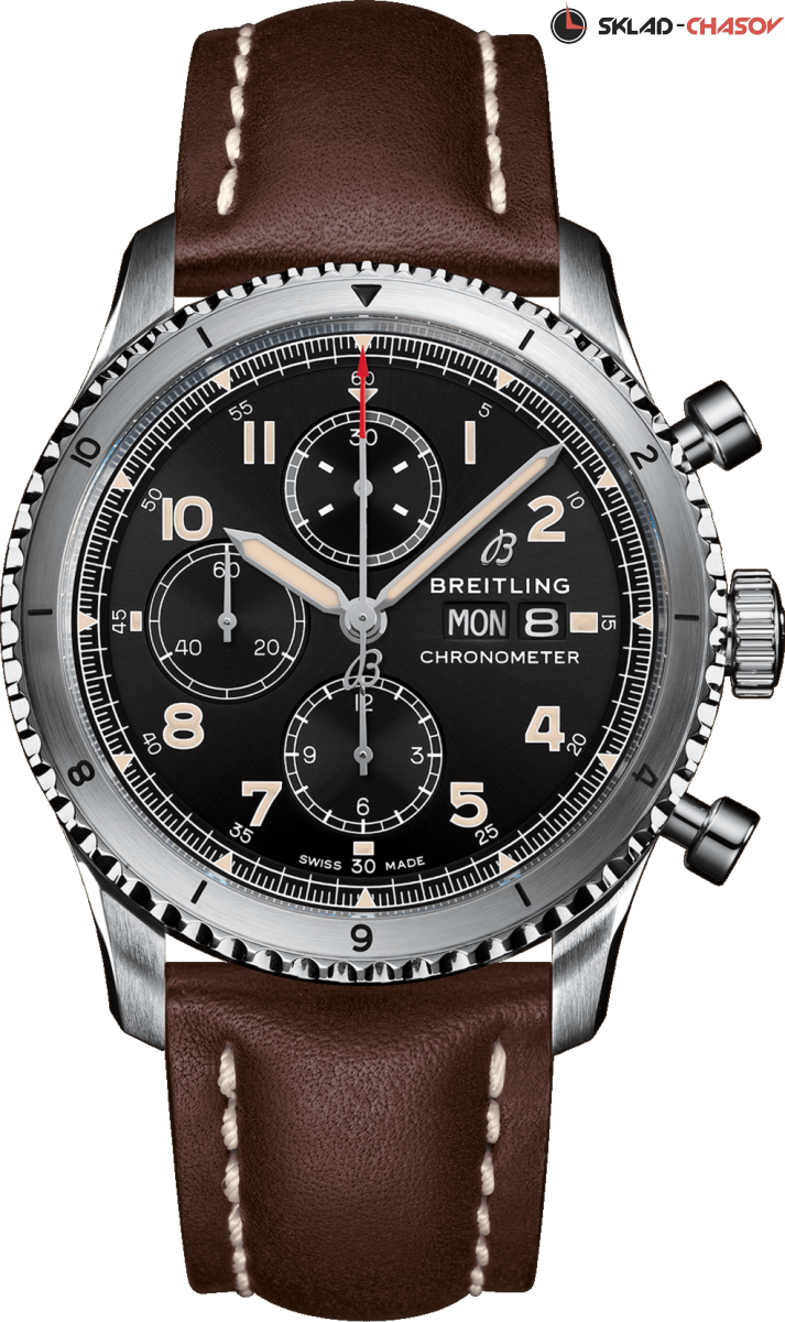 Мужской механический хронограф, индикация даты и дня недели в положении 3 часов, малая секундная стрелка в положении 9 часов, двунаправленный вращающийся безель. Сертификат C.O.S.C.