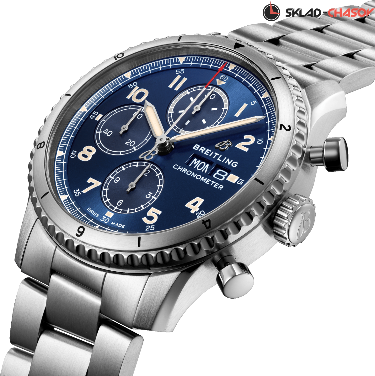 Мужской механический хронограф, индикация даты и дня недели в положении 3 часов, малая секундная стрелка в положении 9 часов, двунаправленный вращающийся безель. Сертификат C.O.S.C.