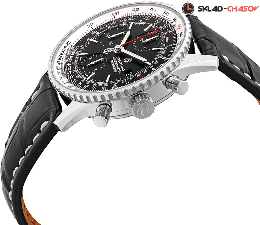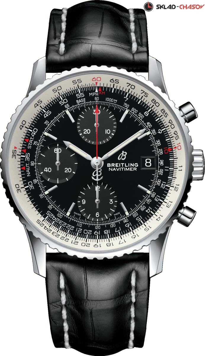 Дань оригинальной версии Navitimer 1. Мужской механический хронограф, индикация даты в положении 3 часов, малая секундная стрелка в положении 9 часов, двунаправленный вращающийся безель с логарифмической шкалой. Сертификат C.O.S.C.