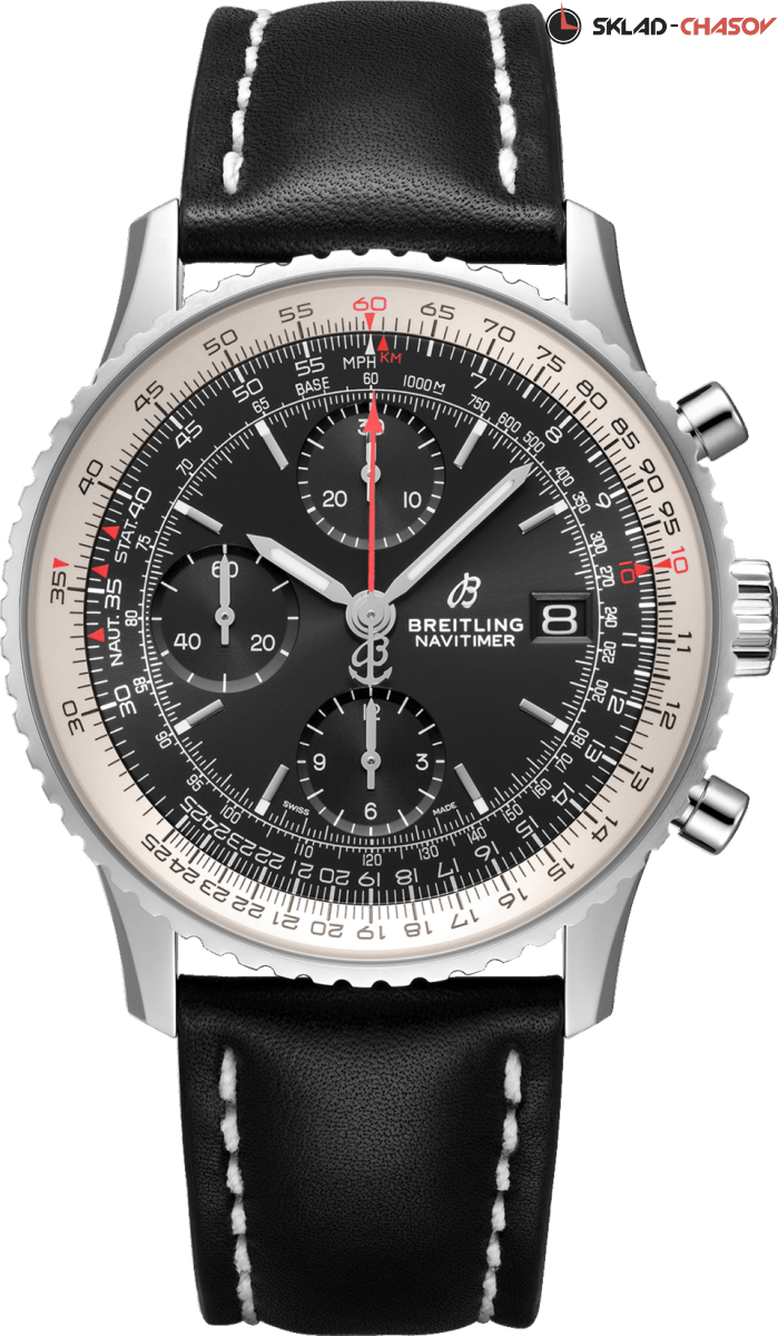 Дань оригинальной версии Navitimer 1. Мужской механический хронограф, индикация даты в положении 3 часов, малая секундная стрелка в положении 9 часов, двунаправленный вращающийся безель с логарифмической шкалой. Сертификат C.O.S.C.