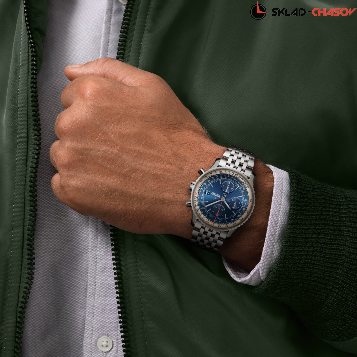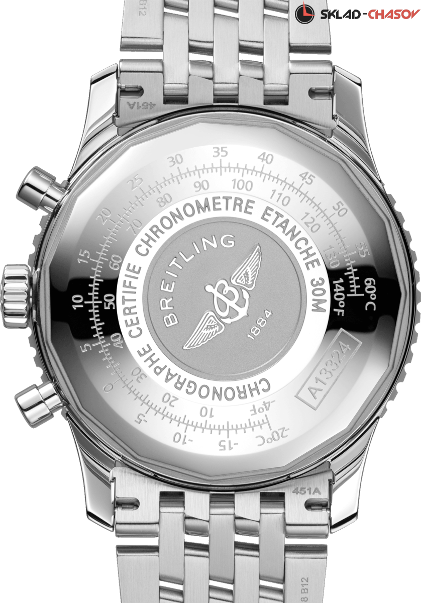 Дань оригинальной версии Navitimer 1. Мужской механический хронограф, индикация даты в положении 3 часов, малая секундная стрелка в положении 9 часов, двунаправленный вращающийся безель с логарифмической шкалой. Сертификат C.O.S.C.