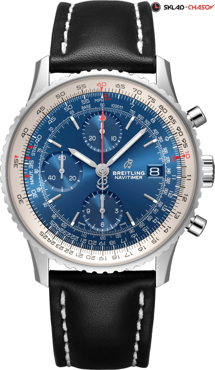 Дань оригинальной версии Navitimer 1. Мужской механический хронограф, индикация даты в положении 3 часов, малая секундная стрелка в положении 9 часов, двунаправленный вращающийся безель с логарифмической шкалой. Сертификат C.O.S.C.