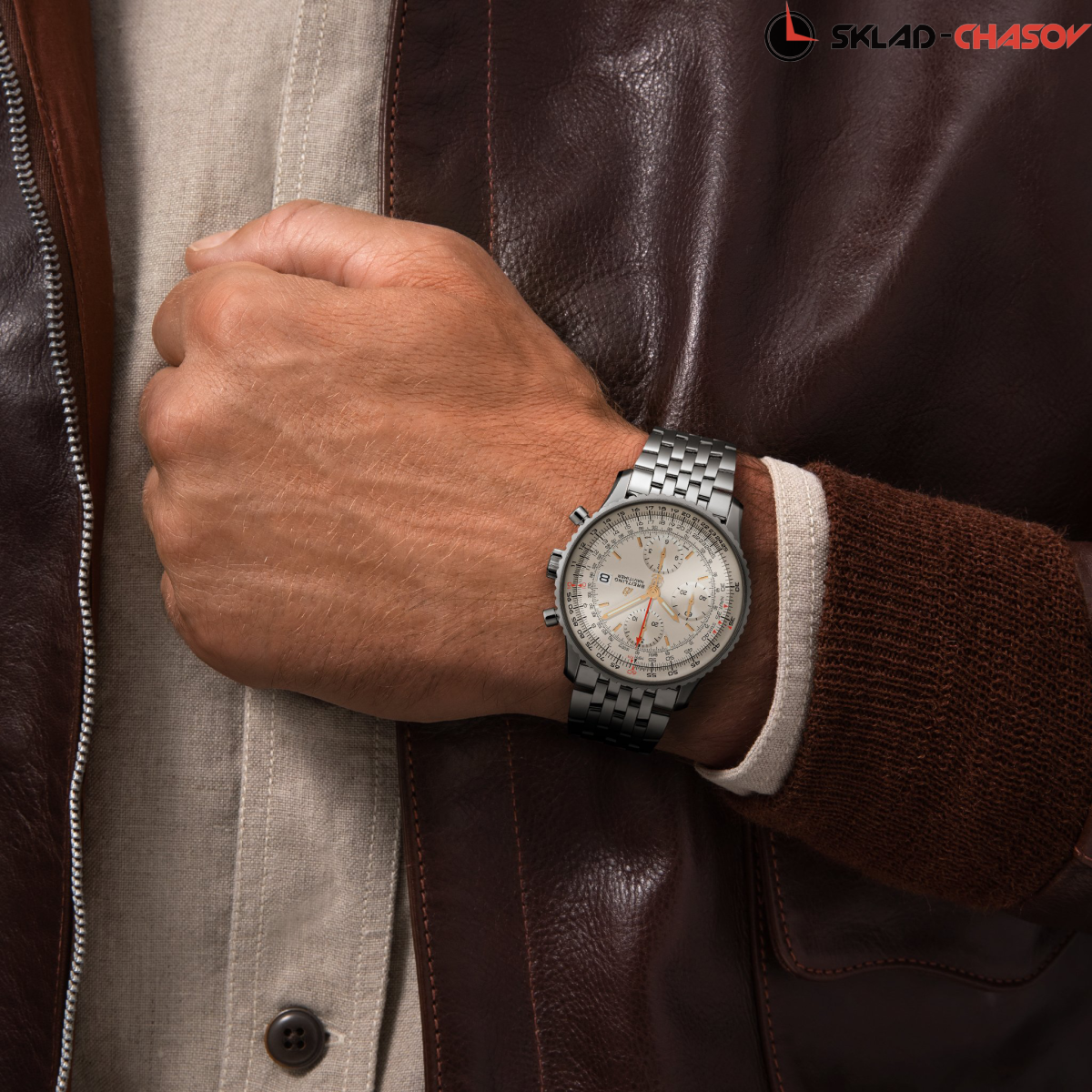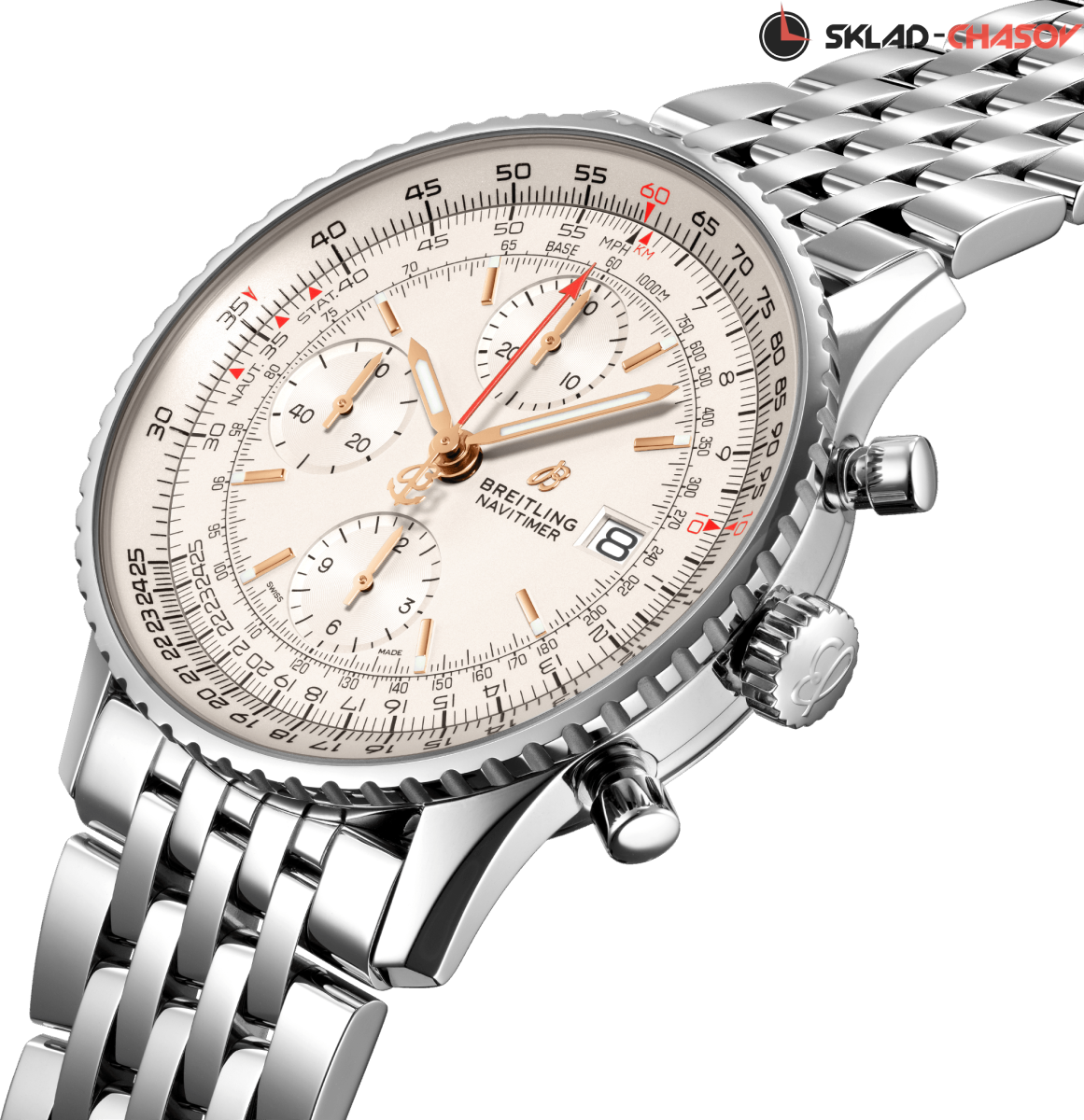 Дань оригинальной версии Navitimer 1. Мужской механический хронограф, индикация даты в положении 3 часов, малая секундная стрелка в положении 9 часов, двунаправленный вращающийся безель с логарифмической шкалой. Сертификат C.O.S.C.