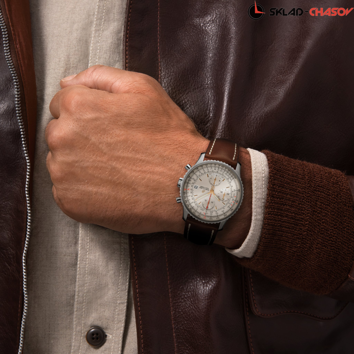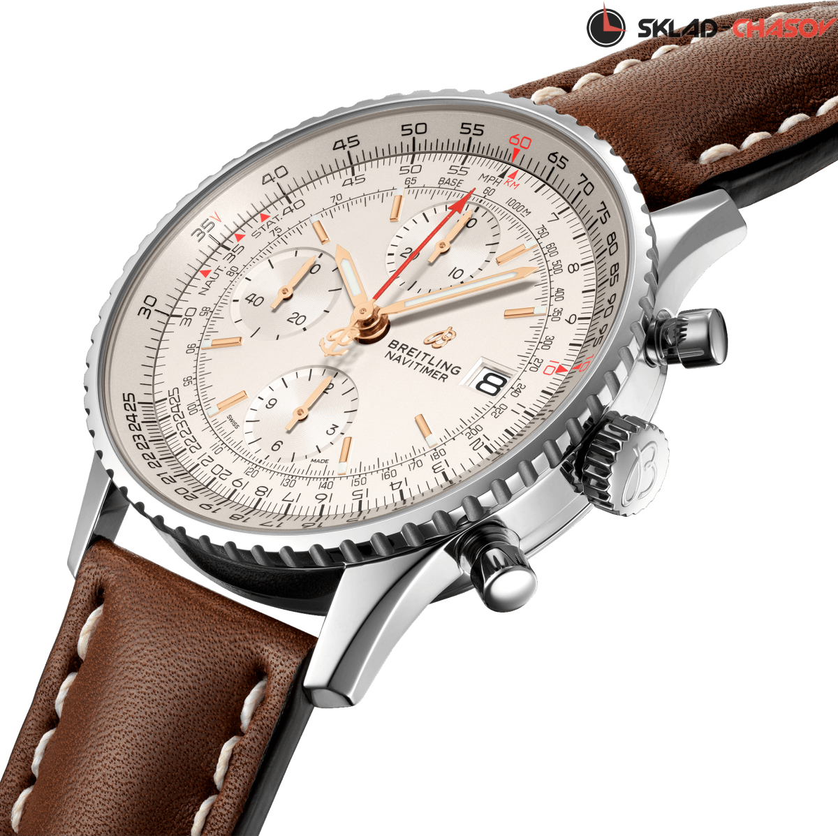 Дань оригинальной версии Navitimer 1. Мужской механический хронограф, индикация даты в положении 3 часов, малая секундная стрелка в положении 9 часов, двунаправленный вращающийся безель с логарифмической шкалой. Сертификат C.O.S.C.