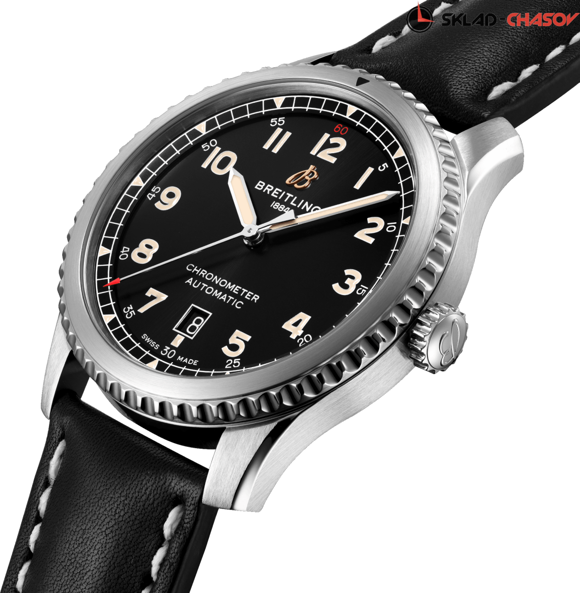 Прямой потомок легендарных часов Breitling 1930-40-х годов. Мужская механическая модель с автоподзаводом. Индикация даты в положении 6 часов. Сертификат C.O.S.C.