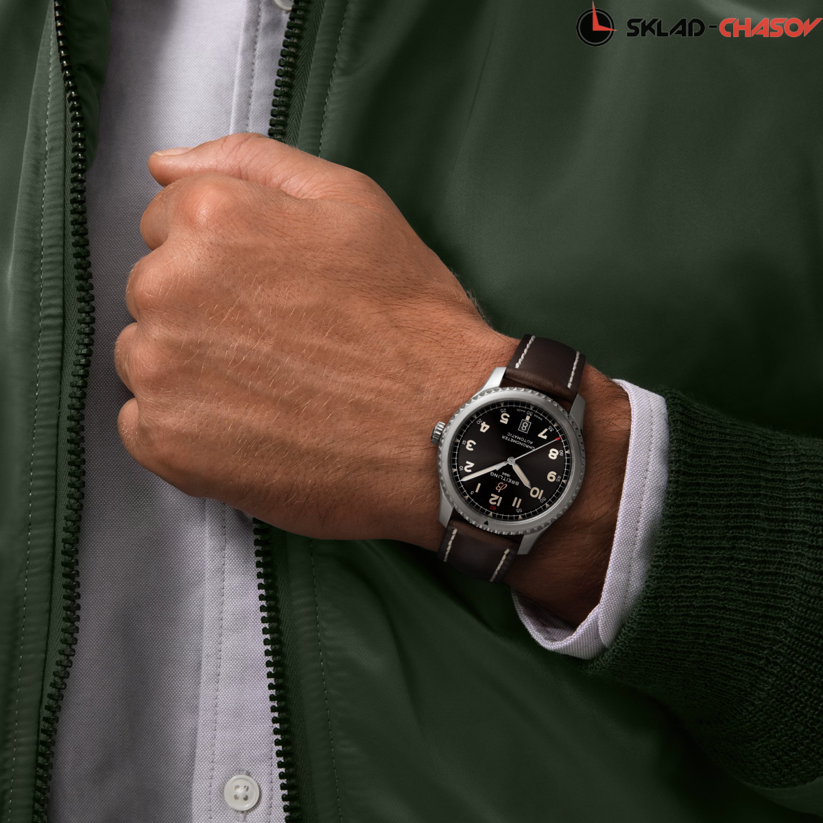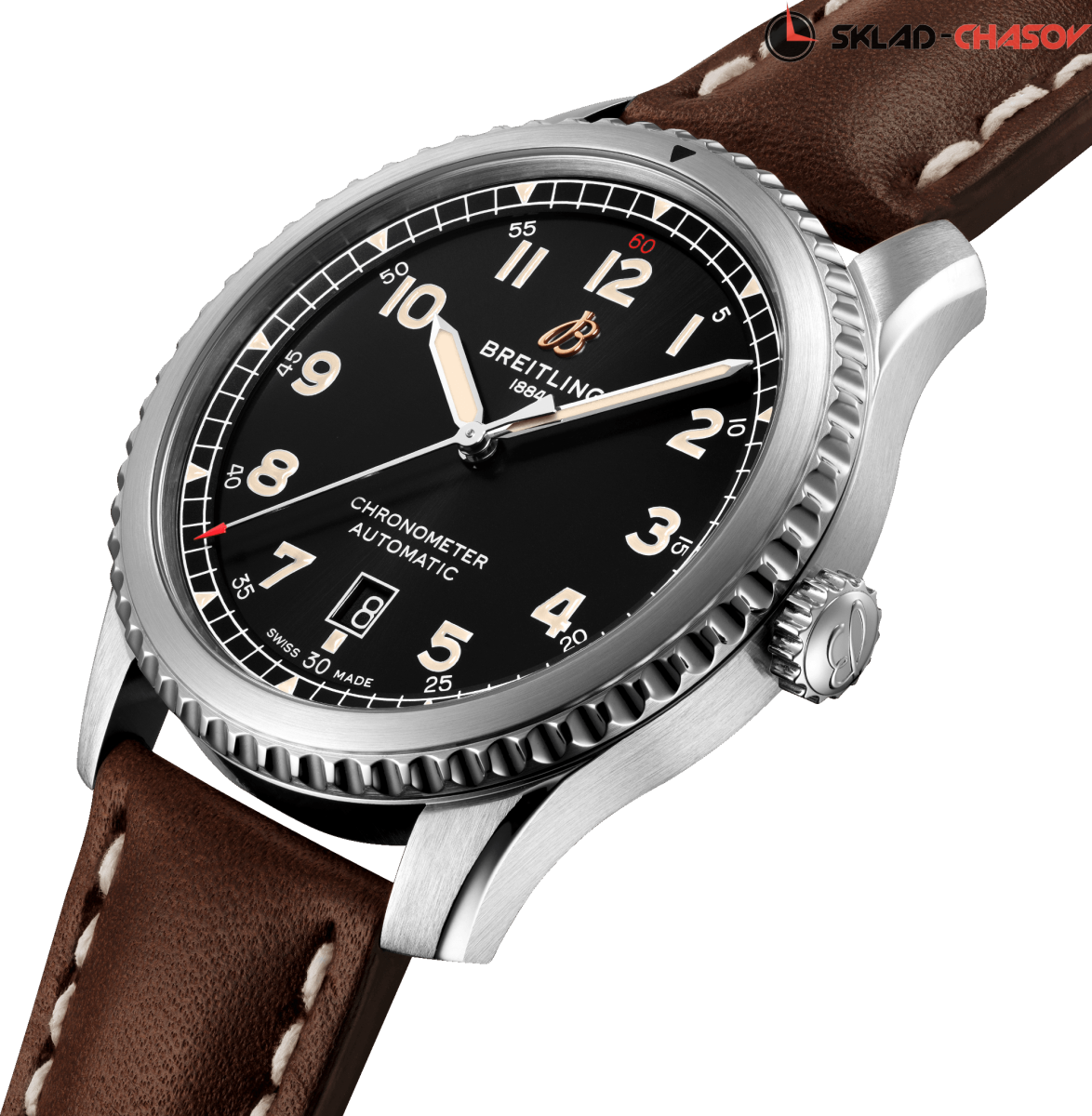 Прямой потомок легендарных часов Breitling 1930-40-х годов. Мужская механическая модель с автоподзаводом. Индикация даты в положении 6 часов. Сертификат C.O.S.C.