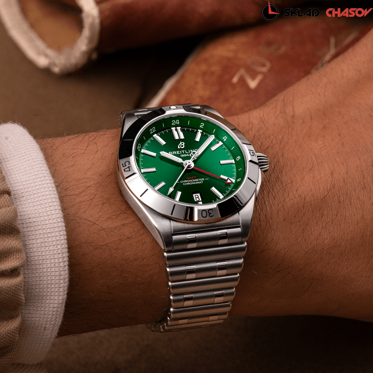 Мужская модель в современном дизайне. На зелёном циферблате красная стрелка GMT в тон основной цветовой гамме на 24-часовой шкале говорит сама за себя. Breitling Caliber 32 оснащены функцией GMT. На 24-часовой шкале пользователь может отследить второй часовой пояс и с первого взгляда определить день сейчас или ночь, в то время как луковичная заводная головка (классическая функция хронографа в форме рифленого купола) позволяет легко подводить время. Часы обладают водозащитой до 200 метров. Хронометр C.O.S.C.