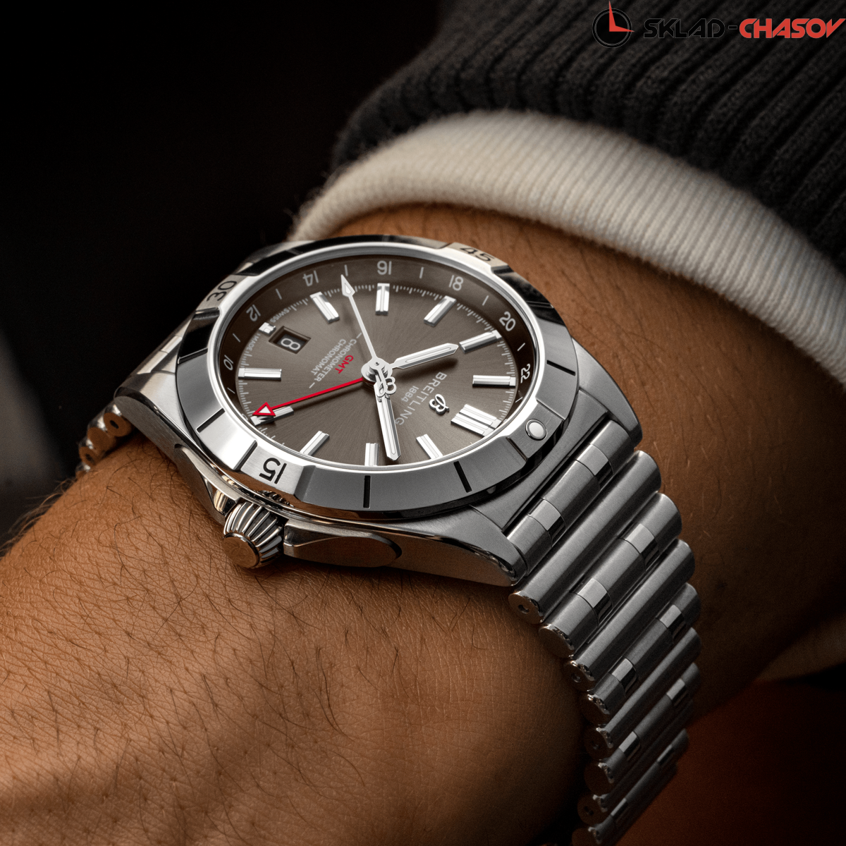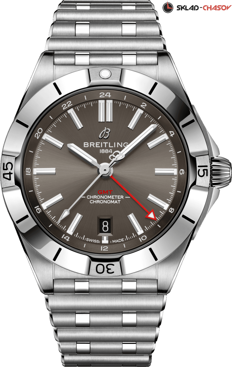 Мужская модель в современном дизайне. На сером циферблате красная стрелка GMT в тон основной цветовой гамме на 24-часовой шкале говорит сама за себя. Breitling Caliber 32 оснащены функцией GMT. На 24-часовой шкале пользователь может отследить второй часовой пояс и с первого взгляда определить день сейчас или ночь, в то время как луковичная заводная головка (классическая функция хронографа в форме рифленого купола) позволяет легко подводить время. Часы обладают водозащитой до 200 метров. Хронометр C.O.S.C.