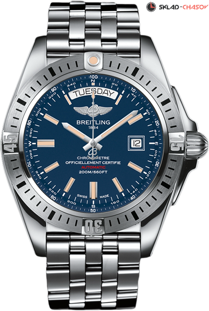 Мужская модель, хронометр C.O.S.C., индикация часов, минут и секунд центральными стрелками, окошко даты в положении 3 часа, окошко дня недели в положении 12 часов, вращающийся в одном направлении безель