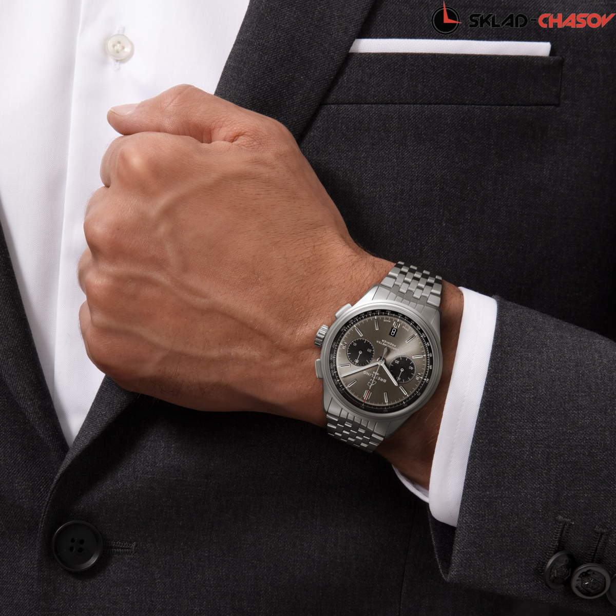 Мужской двухсекционный хронограф с автоподзаводом, апертура даты в районе 6 часов, хронометр C.O.S.C., тахиметрическая шкала, прозрачная задняя крышка.