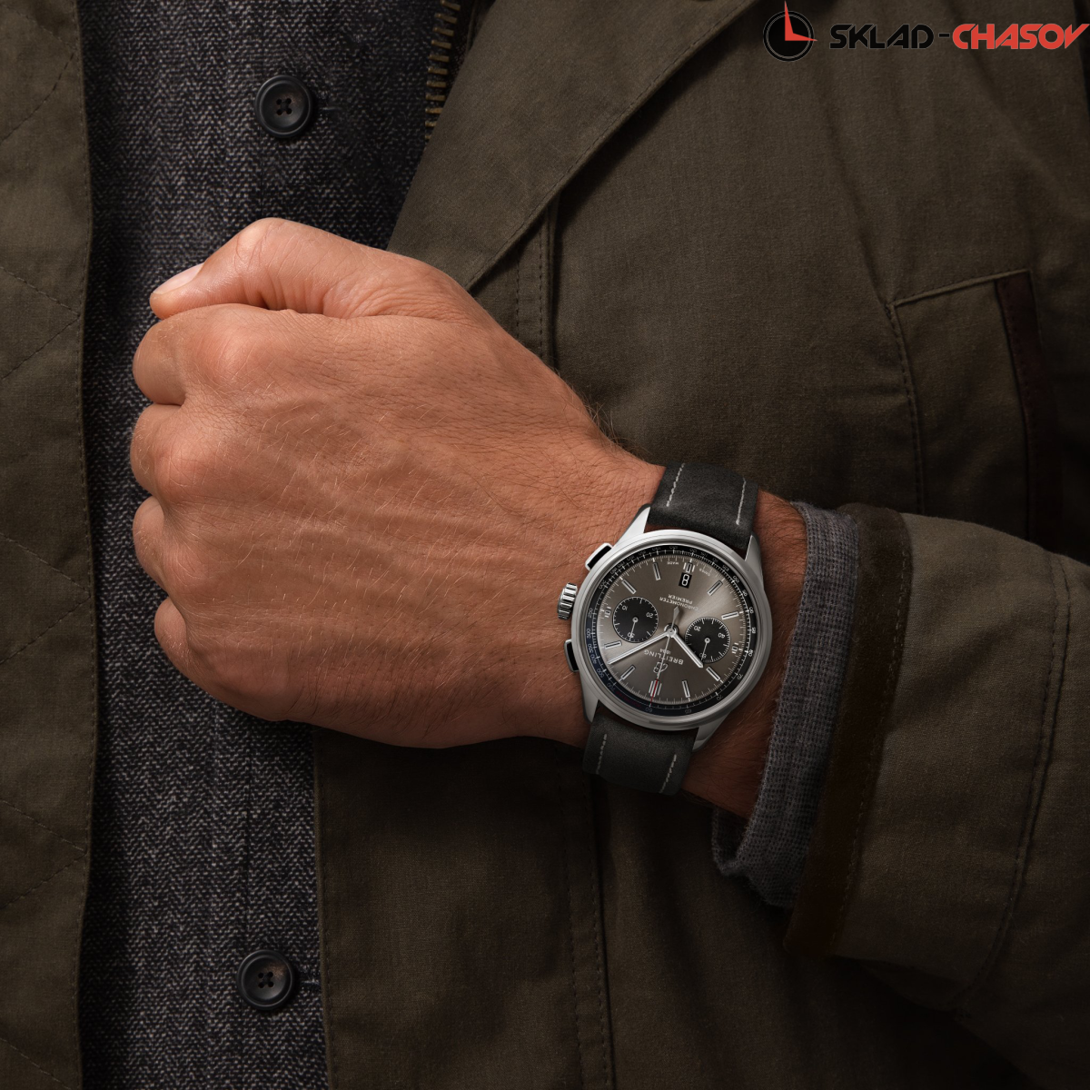 Мужской двухсекционный хронограф с автоподзаводом, апертура даты в районе 6 часов, хронометр C.O.S.C., тахиметрическая шкала, прозрачная задняя крышка.