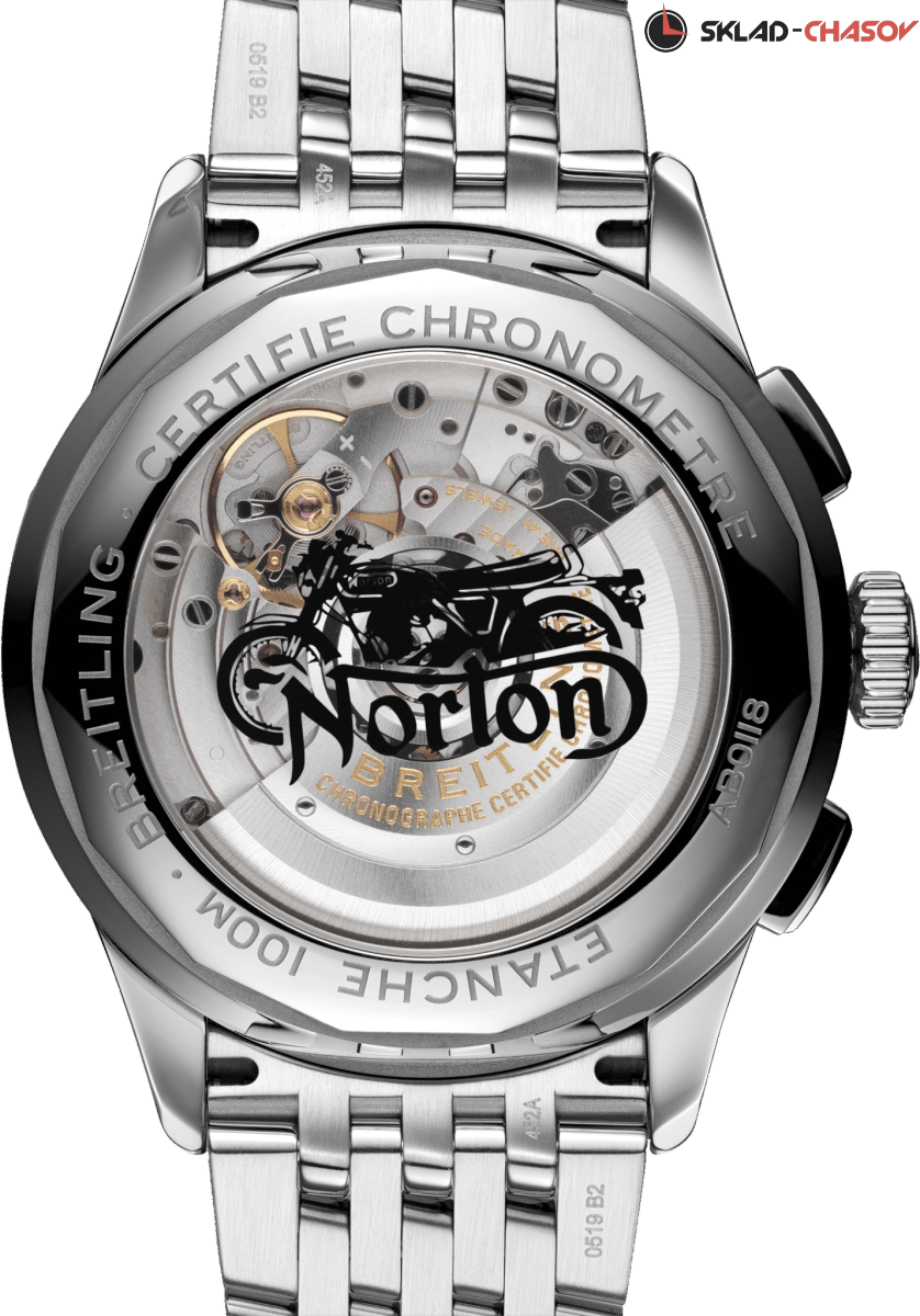 Специальная серия, посвященная партнерству Breitling с легендарным британским производителем мотоциклов Norton. Мужской двухсекционный хронограф с автоподзаводом, апертура даты в районе 6 часов, хронометр C.O.S.C., тахиметрическая шкала. На боку корпуса находится табличка с выгравированной надписью «Norton», прозрачная задняя крышка с логотипом и рисунком мотоцикла.
