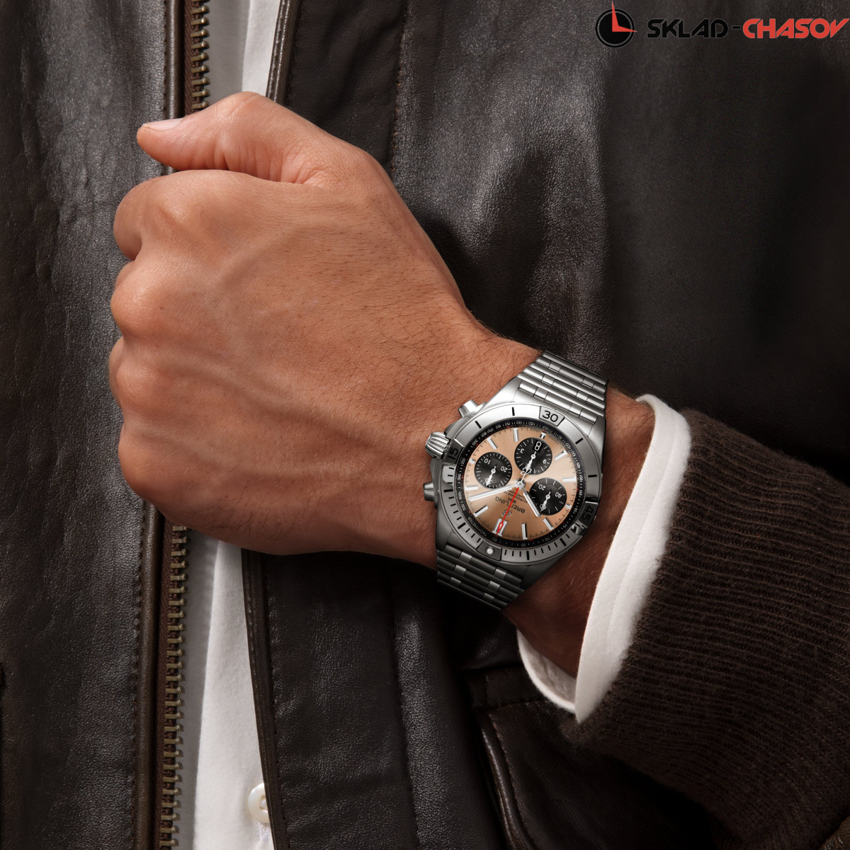 Мужской механический хронограф с автоподзаводом, однонаправленный безель с культовыми вкладками. Секундная стрелка с логотипом на конце. Тахиметрическая шкала. Апертура даты в положении 6 часов. Хронометр C.O.S.C.