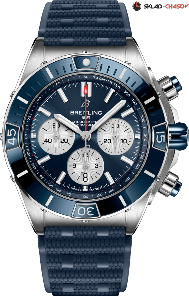 Часы Super Chronomat созданы по мотивам оригинальной модели Chronomat 80-х годов. Модель отличает керамическая инкрустация на безеле, кнопках хронографа и заводной головке. Кроме того, их дополняет каучуковый ремешок в стиле Rouleaux. Эти универсальные спортивные часы на все случаи жизни. Модель оснащена мануфактурным калибром Breitling 01, сертифицированным Швейцарским институтом официального тестирования хронометров (COSC).