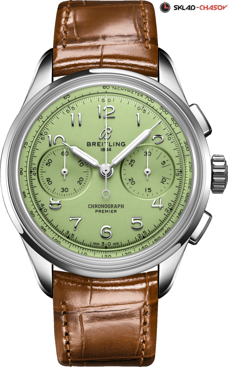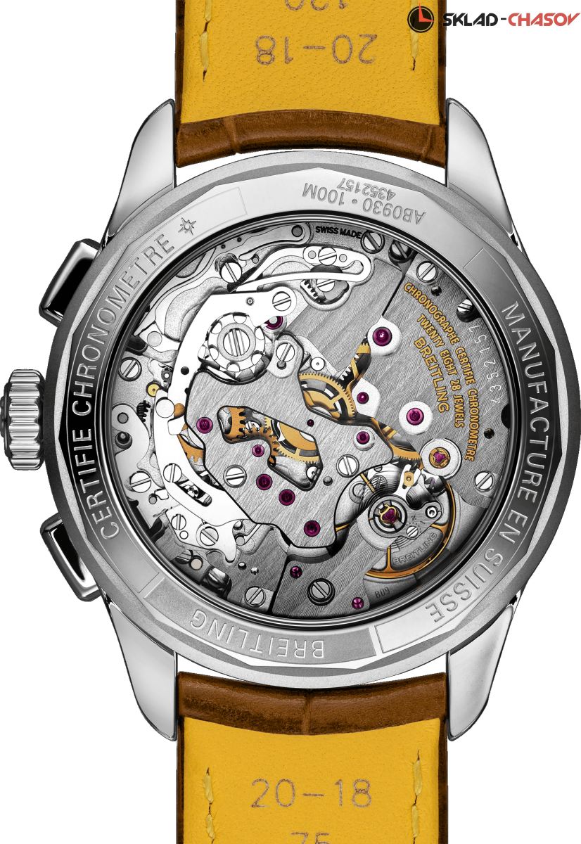 Мужской двухсекционный хронограф оснащен мануфактурным механизмом Breitling B09 с ручным подзаводом, хронометр C.O.S.C., тахиметрическая шкала, прозрачная задняя крышка.