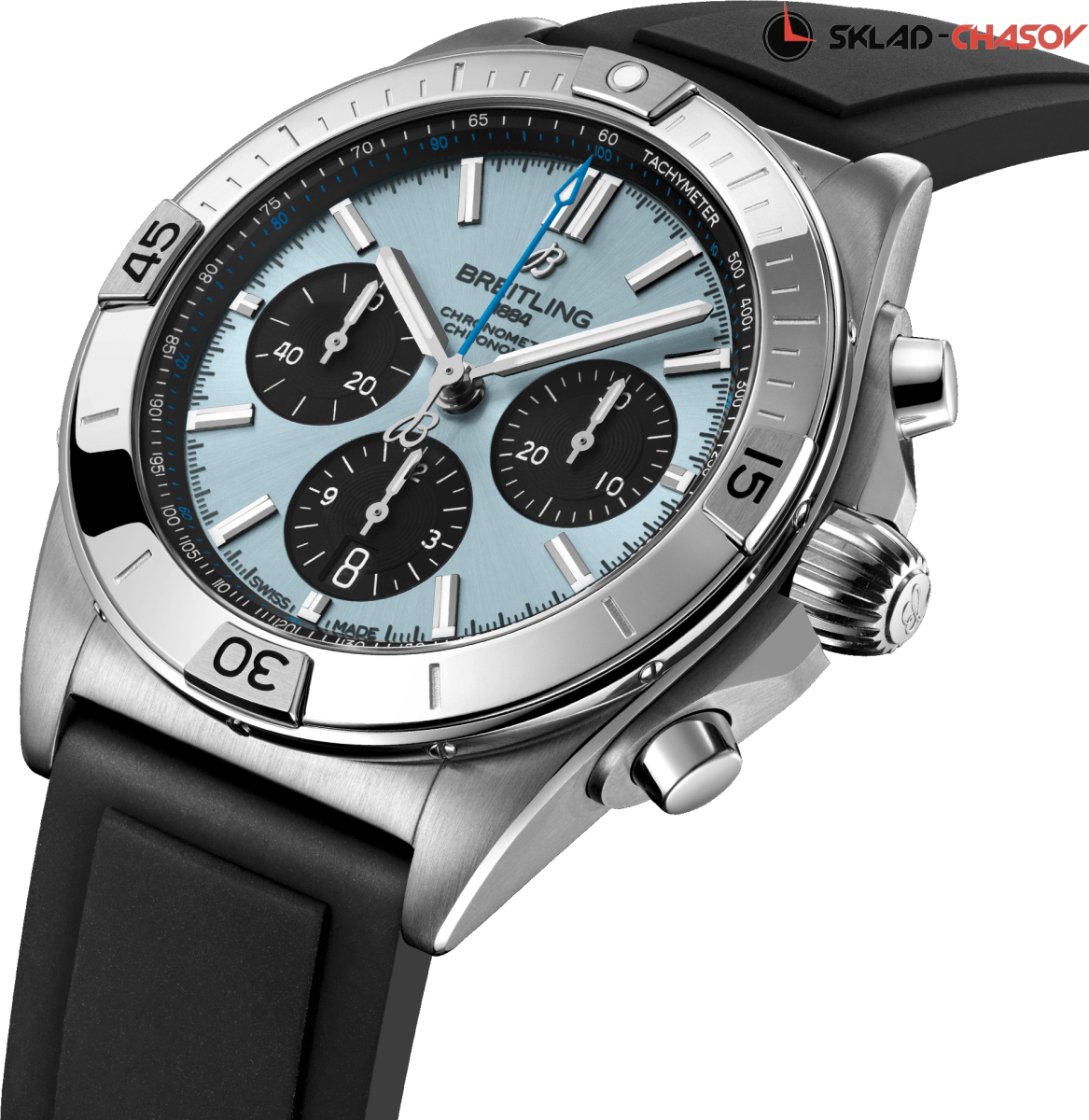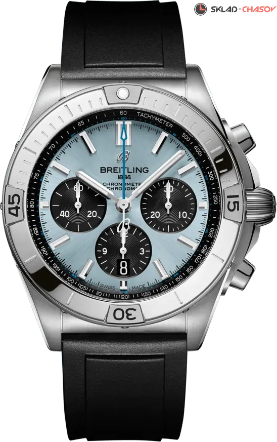 Мужской механический хронограф с автоподзаводом, однонаправленный безель с культовыми вкладками. Секундная стрелка с логотипом на конце. Тахиметрическая шкала. Апертура даты в положении 6 часов. Хронометр C.O.S.C.