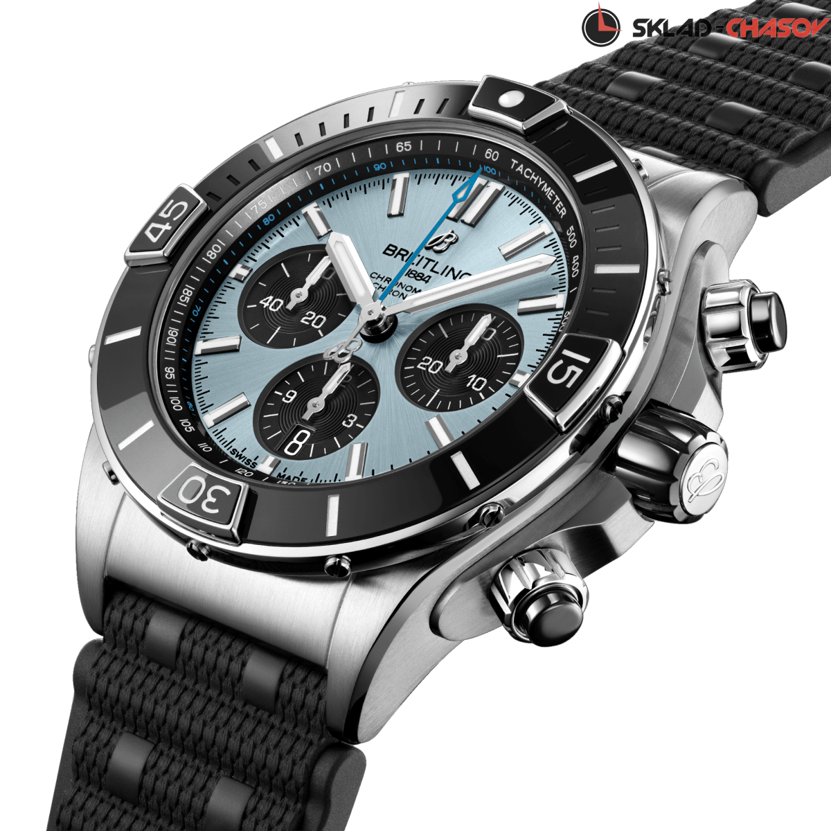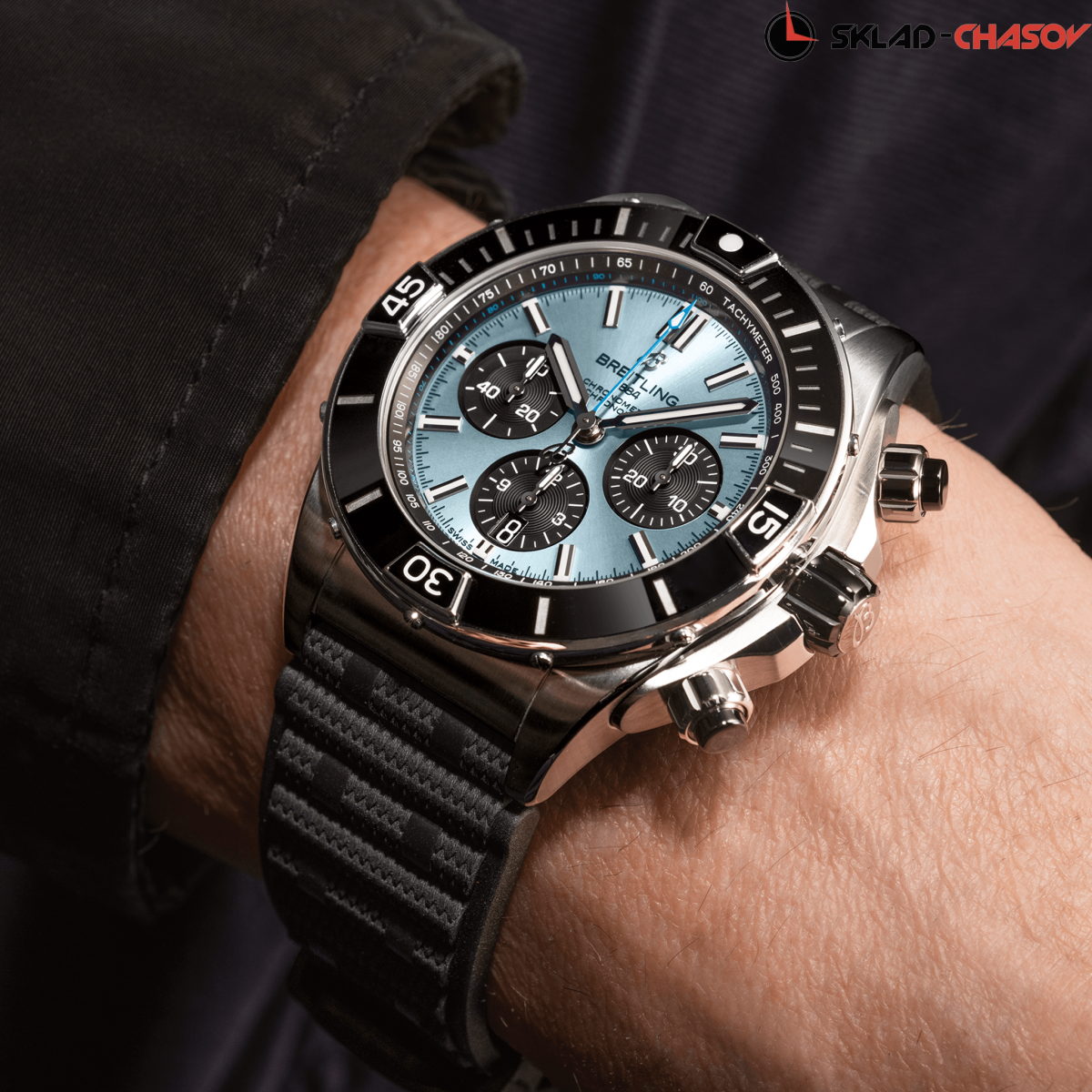 Часы Super Chronomat созданы по мотивам оригинальной модели Chronomat 80-х годов. Модель отличает керамическая инкрустация на безеле, кнопках хронографа и заводной головке. Кроме того, их дополняет каучуковый ремешок в стиле Rouleaux. Эти универсальные спортивные часы на все случаи жизни. Модель оснащена мануфактурным калибром Breitling 01, сертифицированным Швейцарским институтом официального тестирования хронометров (COSC).