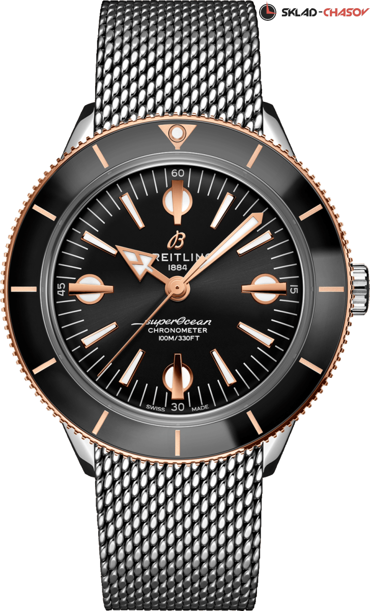 Модель посвящена оригинальным часам из коллекции SuperOcean 1957 года. Стильные и непринужденные, напоминающие серфингистов 60-х годов. Вогнутый двунаправленный керамический безель и циферблат с увеличенными индексами. Задняя крышка с гравировкой. COSC хронометр.
