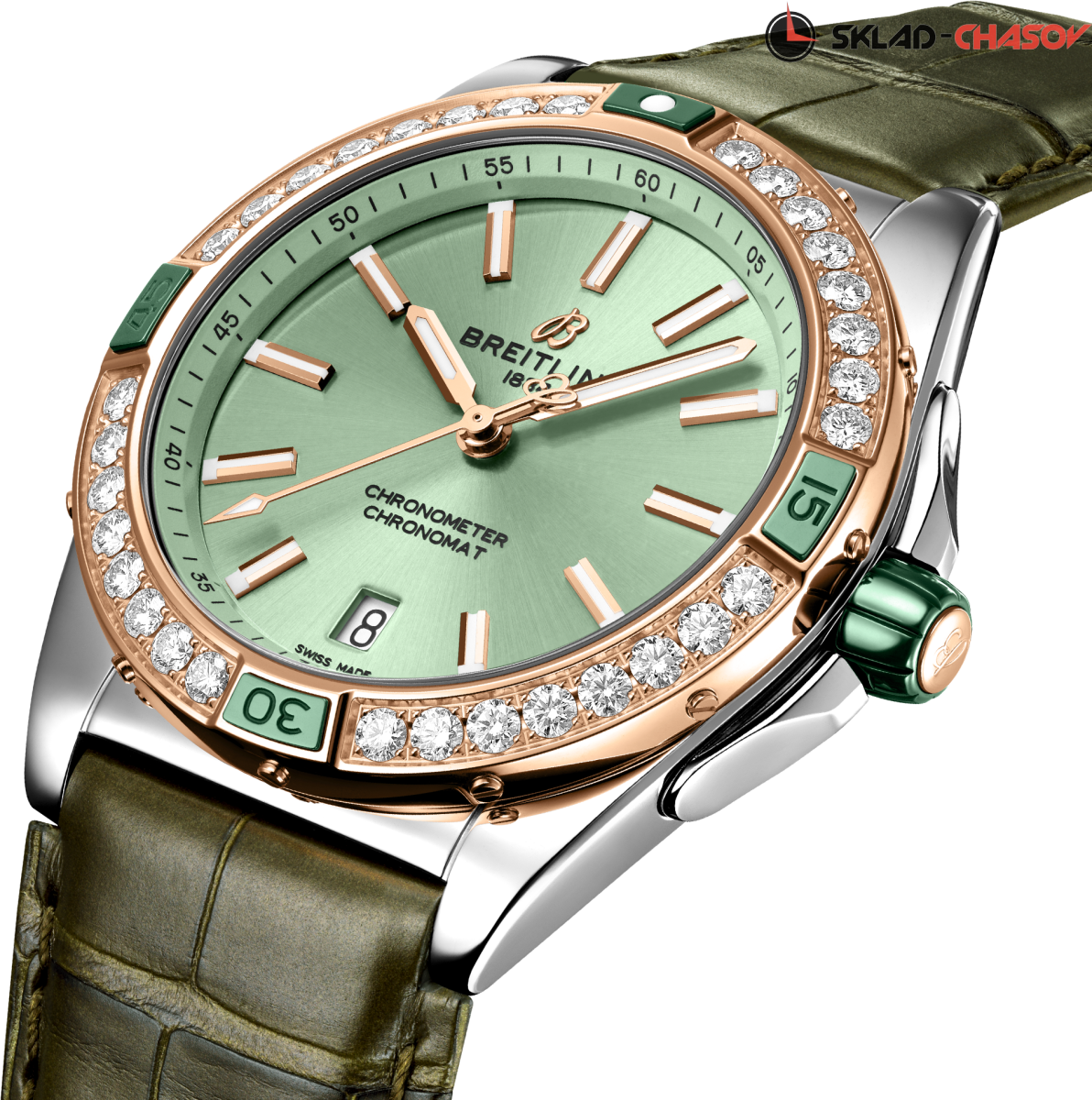 Выразительная и элегантная женская модель в золотом корпусе 750 пробы, механические с автоподзаводом, однонаправленный безель с культовыми вкладками украшен бриллиантами. Секундная стрелка с логотипом на конце. Апертура даты в положении 6 часов. Хронометр C.O.S.C.