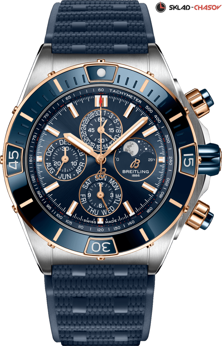 Часы Super Chronomat с четырёхлетним календарем на все случаи жизни, созданы по мотивам оригинальной модели Chronomat 80-х годов. Календарь с индикацией дня недели, даты, месяца, фаз Луны, необходимо корректировать один раз в четыре года, или раз в 1461 день – каждый високосный год. Модель отличает керамическая инкрустация на безеле, кнопках хронографа и заводной головке. Кроме того, их дополняет каучуковый ремешок в стиле Rouleaux. Эти универсальные спортивные часы на все случаи жизни. Модель оснащена мануфактурным калибром Breitling 19, сертифицированным Швейцарским институтом официального тестирования хронометров (COSC).
