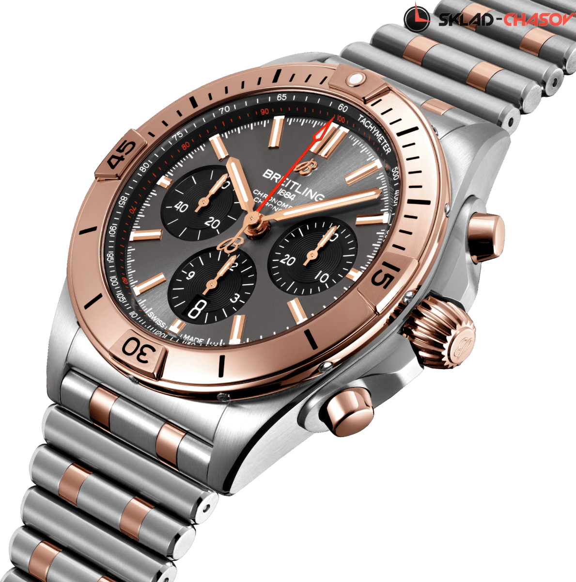 Мужской механический хронограф с автоподзаводом, однонаправленный безель с культовыми вкладками. Секундная стрелка с логотипом на конце. Тахиметрическая шкала. Апертура даты в положении 6 часов. Хронометр C.O.S.C.