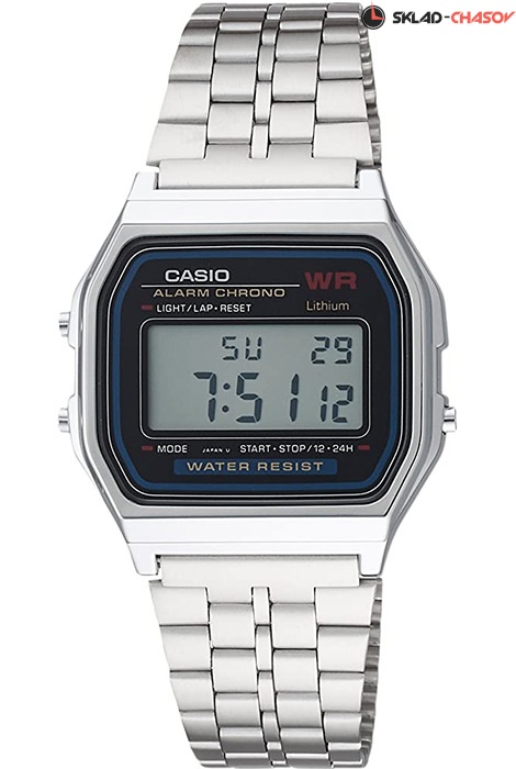 Электронные кварцевые наручные часы Casio Vintage A159W-N1 с цифровой индикацией времени. Калибр механизма — 593. Функциональность данной модели: формат времени 12/24, автоматический календарь с установкой 28 дней на февраль, будильник, сигнал начала часа, секундомер с точностью 1/100 секунды и измерением до 59 минут 59,99 cек., диодная подсветка циферблата. Стальной браслет. Водонепроницаемость WR (3 атм).