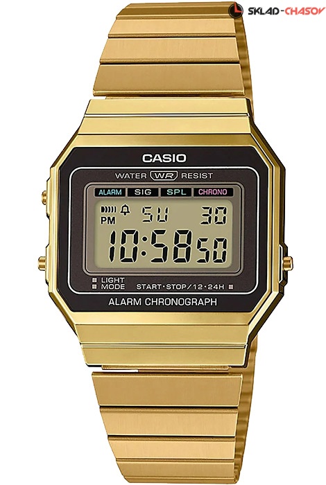 Электронные кварцевые наручные часы Casio Vintage A700WG-9A с цифровой индикацией времени. Калибр механизма — 3472. Функциональность данной модели: формат времени 12/24, автоматический календарь с установкой 28 дней на февраль, будильник, сигнал начала часа, секундомер с точностью 1/100 секунды и измерением до 59 минут 59,99 cек., диодная подсветка циферблата. Стальной браслет. На браслет нанесено стойкое PVD покрытие. Водонепроницаемость WR (3 атм).