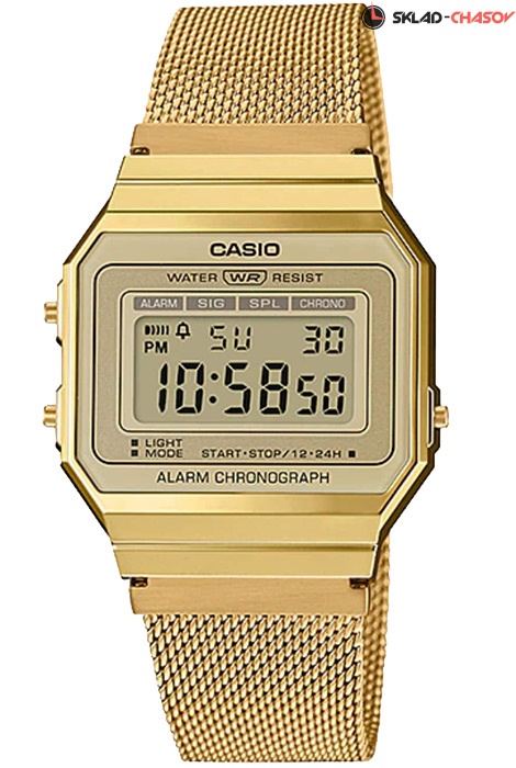 Электронные кварцевые наручные часы Casio Vintage A700WMG-9A с цифровой индикацией времени. Калибр механизма — 3472. Функциональность данной модели: формат времени 12/24, автоматический календарь с установкой 28 дней на февраль, будильник, сигнал начала часа, секундомер с точностью 1/100 секунды и измерением до 59 минут 59,99 cек., диодная подсветка циферблата. Стальной браслет миланского плетения. На браслет нанесено стойкое PVD покрытие. Водонепроницаемость WR (3 атм).
