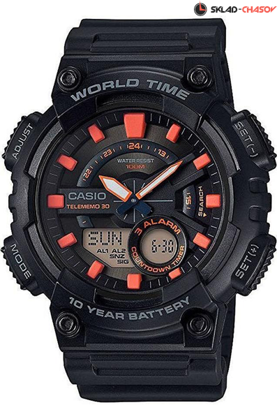 Кварцевые мужские наручные часы Casio AEQ-110W-1A2 с цифровой+стрелочной индикацией времени. Калибр механизма — 5479. Функциональность данной модели: формат времени 12/24, функция летнего времени (DST), мировое время 30 городов (29 часовых поясов), вечный календарь до 2099 года, 3 независимых будильника, сигнал начала часа, секундомер с точностью 1/100 секунды и измерением до 23 часов 59 минут 59,99 cек., таймер обратного отсчета (диапазон времени 24 часа), записная книжка телефонных номеров на 30 записей, люминесцентное напыление на стрелках и метках часов (светятся в темноте). Водонепроницаемость WR100 (10 атм). Батарейка на 10 лет работы.