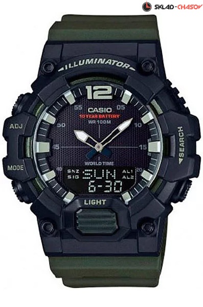 Кварцевые мужские наручные часы Casio HDC-700-3A с цифровой+стрелочной индикацией времени. Калибр механизма — 5565. Функциональность данной модели: формат времени 12/24, функция летнего времени (DST), мировое время 30 городов (29 часовых поясов), вечный календарь до 2099 года, 3 независимых будильника, сигнал начала часа, секундомер с точностью 1/100 секунды и измерением до 23 часов 59 минут 59,99 cек., таймер обратного отсчета (диапазон времени 24 часа), записная книжка телефонных номеров на 30 записей, диодная подсветка циферблата и люминесцентное напыление на стрелках и метках часов. Водонепроницаемость WR100 (10 атм). Батарейка на 10 лет работы.