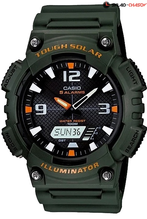 Кварцевые мужские наручные часы на солнечной батарее Casio AQ-S810W-3A с цифровой+стрелочной индикацией времени. Калибр механизма — 5208. Аккумулятор данной модели заряжается от любого источника света. Срок работы аккумулятора с полным зарядом — около 6-ти месяцев. Примерный срок службы аккумулятора — 10 лет. Функциональность данной модели: режим сохранения энергии (дисплей гаснет для экономии энергии, когда часы остаются в темноте), индикатор заряда батареи, формат времени 12/24, функция летнего времени (DST), мировое время 48 городов (31 часовой пояс), вечный календарь до 2099 года, 5 независимых будильников, сигнал начала часа, секундомер с точностью 1/100 секунды и измерением до 59 минут 59,99 cек., 2 независимых таймера обратного отсчета (диапазон времени 99 минут 55 сек.), функция выключения звука нажатия кнопок (Mute), диодная подсветка циферблата с возможностью выбора времени свечения (1.5 или 3 секунды), Необритовое (Neobrite) люминесцентное напыление на стрелках часов. Водонепроницаемость WR100 (10 атм).