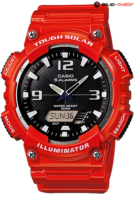Кварцевые наручные часы на солнечной батарее Casio AQ-S810WC-4A с цифровой+стрелочной индикацией времени. Калибр механизма — 5208. Срок работы аккумулятора с полным зарядом — около 5-ти месяцев. Примерный срок службы аккумулятора — 10 лет. Функциональность данной модели: режим сохранения энергии, индикатор заряда батареи, формат времени 12/24, функция летнего времени (DST), мировое время 48 городов (31 часовой пояс), вечный календарь до 2099 года, 5 независимых будильников, сигнал начала часа, секундомер с точностью 1/100 секунды и измерением до 59 минут 59,99 cек., 2 независимых таймера обратного отсчета (диапазон времени 99 минут 55 сек.), функция выключения звука кнопок (Mute), диодная подсветка циферблата и люминесцентное напыление на стрелках и метках часов. Водонепроницаемость WR100 (10 атм).