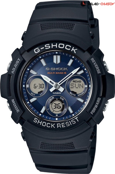 Противоударные мужские наручные часы на солнечной батарее Casio AWG-M100SB-2A с радиоконтролем коллекции G-Shock. Калибр механизма — 5230. Функциональность данной модели: режим сохранения энергии, индикатор заряда батареи, радиоконтроль точного времени (Wave Ceptor), формат времени 12/24, мировое время 48 городов (31 часовой пояс), вечный календарь до 2099 года, функция летнего времени (DST), 5 независимых будильников, сигнал начала часа, секундомер с точностью 1/100 секунды и измерением до 59 минут 59,99 cек., таймер обратного отсчета (диапазон времени 100 минут), функция выключения звука кнопок (Mute), диодная подсветка циферблата с функцией авто (включается при наклоне часов на 40°) и люминесцентное напыление на стрелках и метках. Водонепроницаемость WR200 (20 атм).