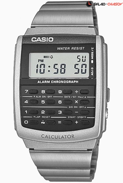 Кварцевые мужские наручные часы с калькулятором Casio CA-506-1. Калибр механизма — 3208. Функциональность данной модели: калькулятор, формат времени 12/24, вечный календарь до 2099 года, будильник, сигнал начала часа, секундомер с точностью 1/100 секунды и измерением до 23 часов 59 минут 59,99 cек., функция двойного времени, функция выключения звука нажатия кнопок (Mute). Стальной браслет. Водонепроницаемость WR (3 атм).