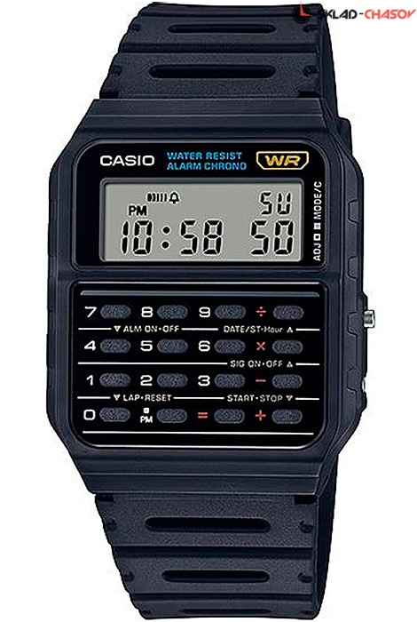 Кварцевые мужские наручные часы с калькулятором Casio CA-53W-1. Калибр механизма — 3208. Функциональность данной модели: калькулятор, формат времени 12/24, вечный календарь до 2099 года, будильник, сигнал начала часа, секундомер с точностью 1/100 секунды и измерением до 23 часов 59 минут 59,99 cек., функция двойного времени, функция выключения звука нажатия кнопок (Mute). Водонепроницаемость WR (3 атм).