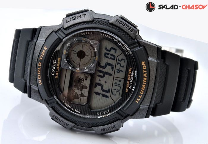 Электронные кварцевые мужские наручные часы Casio AE-1000W-1A с цифровой индикацией времени. Калибр механизма — 3198. Функциональность данной модели: формат времени 12/24, мировое время 48 городов (31 часовой пояс), вечный календарь до 2099 года, 5 независимых будильников, сигнал начала часа, секундомер с точностью 1/100 секунды и измерением до 23 часов 59 минут 59,99 cек., таймер обратного отсчета (диапазон времени 24 часа), функция выключения звука кнопок (Mute), диодная подсветка циферблата. Батарейка на 10 лет работы. Водонепроницаемость WR100 (10 атм).