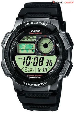Электронные кварцевые мужские наручные часы Casio AE-1000W-1B с цифровой индикацией времени. Калибр механизма — 3198. Функциональность данной модели: формат времени 12/24, мировое время 48 городов (31 часовой пояс), вечный календарь до 2099 года, 5 независимых будильников, сигнал начала часа, секундомер с точностью 1/100 секунды и измерением до 23 часов 59 минут 59,99 cек., таймер обратного отсчета (диапазон времени 24 часа), функция выключения звука кнопок (Mute), диодная подсветка циферблата. Батарейка на 10 лет работы. Водонепроницаемость WR100 (10 атм).