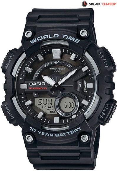 Кварцевые мужские наручные часы Casio AEQ-110W-1A с цифровой+стрелочной индикацией времени. Калибр механизма — 5479. Функциональность данной модели: формат времени 12/24, функция летнего времени (DST), мировое время 30 городов (29 часовых поясов), вечный календарь до 2099 года, 3 независимых будильника, сигнал начала часа, секундомер с точностью 1/100 секунды и измерением до 23 часов 59 минут 59,99 cек., таймер обратного отсчета (диапазон времени 24 часа), записная книжка телефонных номеров на 30 записей, люминесцентное напыление на стрелках и метках часов (светятся в темноте). Водонепроницаемость WR100 (10 атм). Батарейка на 10 лет работы.