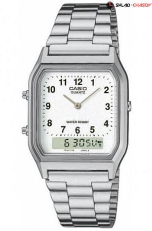 Кварцевые мужские наручные часы Casio AQ-230A-7B с цифровой+стрелочной индикацией времени. Калибр механизма — 1301. Функциональность данной модели: формат времени 12/24, функция двойного времени, автоматический календарь с установкой 28 дней на февраль, будильник, сигнал начала часа, секундомер с точностью 1/100 секунды и измерением до 59 минут 59,99 cек.