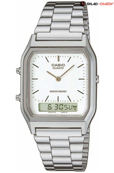 Кварцевые мужские наручные часы Casio AQ-230A-7D с цифровой+стрелочной индикацией времени. Калибр механизма — 1301. Функциональность данной модели: формат времени 12/24, функция двойного времени, автоматический календарь с установкой 28 дней на февраль, будильник, сигнал начала часа, секундомер с точностью 1/100 секунды и измерением до 59 минут 59,99 cек.