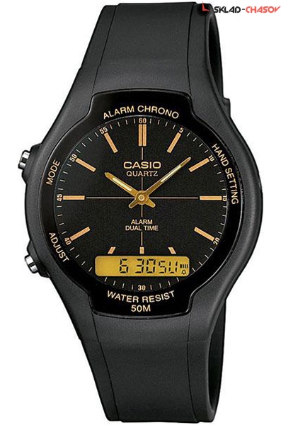 Кварцевые мужские наручные часы Casio AW-90H-9E с цифровой+стрелочной индикацией времени. Калибр механизма — 3321. Функциональность данной модели: формат времени 12/24, функция двойного времени, автоматический календарь, будильник, сигнал начала часа, секундомер с точностью 1/100 секунды и измерением до 59 минут 59,99 cек.