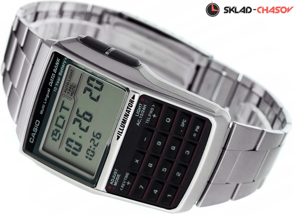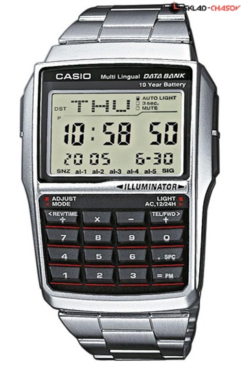 Кварцевые мужские наручные часы с калькулятором Casio DBC-32D-1A. Калибр механизма — 2888. Функциональность данной модели: русифицированный индикатор дня недели, калькулятор, формат времени 12/24, вечный календарь до 2099 года, 5 независимых многофункциональных будильников, сигнал начала часа, секундомер с точностью 1/100 секунды и измерением до 23 часов 59 минут 59,99 cек., функция двойного времени, записная книжка телефонных номеров на 25 записей, диодная подсветка циферблата с функцией авто (включается при наклоне часов на 40°), функция выключения звука кнопок (Mute).