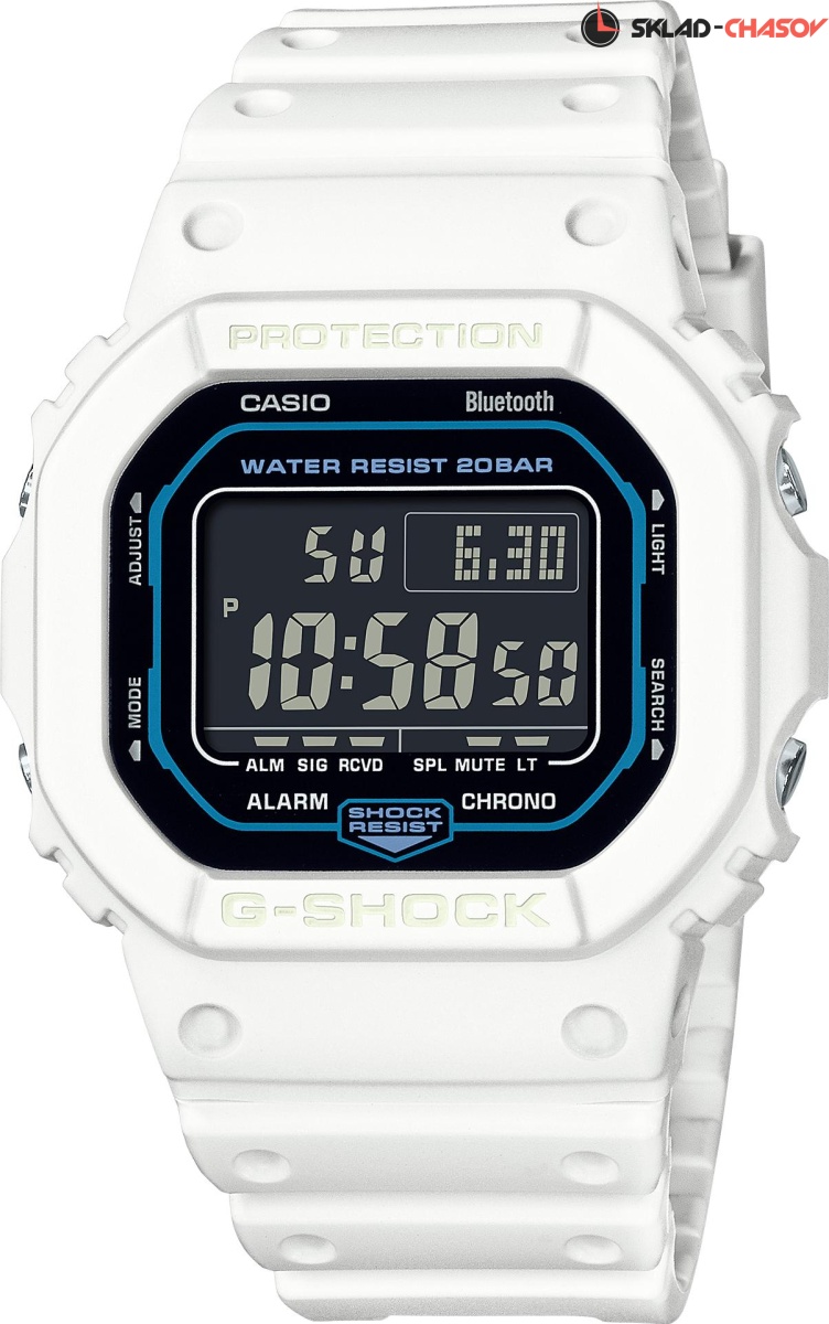 Спортивные японские мужские часы с секундомером лимитированной коллекции Clear Remix к 40-летию G-SHOCK Casio G-Shock DW-B5600SF-7E, кварцевый механизм с высокой точностью. Часы оснащены технологией Bluetooth®, которая предлагает энергосберегающую возможность передачи данных нажатием кнопки. С помощью Bluetooth® вы можете подключить часы к смартфону, не используя провод, и получить доступ к целому ряду полезных функций. Smartphone time. Если часы подключены к смартфону, время устанавливается автоматически и отображается текущее время, так что во всем мире. При недостаточной освещенности только поворот Вашего запястья включит яркую цветную подсветку часов. Ударопрочная конструкция защищает от ударов и вибрации. Отображение текущего времени в основных городах и конкретных областях по всему миру. Функция секундомера- 1/100 сек. - 24 часа. Прошедшее время измеряется с точностью в 1/100 секунды. Пределы измерения достигают 24 часов. Таймер - 1/1 сек. - 24 часа. 5 ежедневных будильников. Включение/выключение звука кнопок. Можно отключить звук при нажатии кнопок. Это означает, что часы больше не будут издавать звуковой сигнал при переключении от одной функции на другую. Заранее установленные звуковые сигналы или таймеры обратного отчета остаются активными, если звук кнопок отключен. Функция поиска телефона При нажатии кнопки на ваших часах смартфон подает звуковой сигнал. Названия дней могут отображаться на разных языках. Автоматический календарь. После настройки автоматический календарь всегда отображает точную дату. 12/24-часовое отображение времени. Прочное, устойчивое к царапинам минеральное стекло защищает часы от повреждений. Корпус из полимерного пластика. Ремешок из полимерного материала.