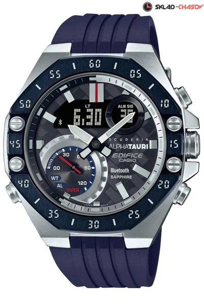 Кварцевые наручные часы Casio ECB-10AT-1A коллекции Edifice с технологией Bluetooth®. Лимитированная серия. Дизайн выполнен в стиле известной итальянской команды Scuderia AlphaTauri, выступающей в гонках Formula 1. Калибр механизма — 5618. С помощью Bluetooth® вы можете подключить часы к смартфону и получить доступ к полезным функциям. Часы автоматически связываются с телефоном через Bluetooth® и проверяют точность времени 4 раза в сутки. Возможности Bluetooth в данной модели: С помощью специального приложения EDIFICE Connected возможно установить время в конкретном городе (300 городов), установить точное текущее время, установить будильник, просмотреть показания секундомера, подстроить положение стрелок. Функция поиска телефона, можно включить тоновый сигнал на телефоне, что позволит быстро найти телефон. Функциональность данной модели: индикация даты и дня недели (на Русском языке); вечный календарь до 2099 года; 5 независимых будильников и сигнал начала часа; секундомер с измерением до 23 часов 59 минут 59 cек. и записью результатов (200 записей); таймер обратного отсчета (диапазон времени 24 часа). Стрелки покрыты люминесцентным напылением (светятся в темноте), диодная подсветка циферблата с функцией авто (включается при наклоне часов на 40°). На корпус частично нанесено стойкое PVD покрытие. Сапфировое стекло. Водонепроницаемость WR100 (10 атм).