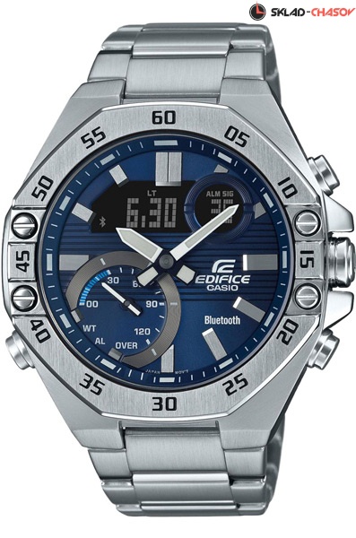 Кварцевые наручные часы Casio ECB-10D-2A коллекции Edifice с технологией Bluetooth®. Калибр механизма — 5618. С помощью Bluetooth® вы можете подключить часы к смартфону и получить доступ к полезным функциям. Часы автоматически связываются с телефоном через Bluetooth® и проверяют точность времени 4 раза в сутки. Возможности Bluetooth в данной модели: С помощью специального приложения EDIFICE Connected возможно установить время в конкретном городе (300 городов), установить точное текущее время, установить будильник, просмотреть показания секундомера, подстроить положение стрелок. Функция поиска телефона - включение тонового сигнала на телефоне для быстрого поиска. Функциональность данной модели: индикация даты и дня недели (в том числе на Русском языке); мировое время в 38 городах (38 часовых поясов); вечный календарь до 2099 года; 5 независимых будильников и сигнал начала часа; секундомер с точностью 1/1000 сек. и измерением до 23 часов 59 минут 59 cек.; таймер обратного отсчета (диапазон времени 24 часа); двойная диодная подсветка циферблата с функцией авто (включается при наклоне часов на 40°) и возможностью выбора времени свечения (1.5 или 3 секунды) + необритовое (Neobrite) покрытие на стрелках и метках для длительного послесвечения в темноте; функция перемещения стрелок (помогает определить значения в окошках с цифровой индикацией, когда стрелки их закрывают); функция выключения звука нажатия кнопок; режим полёта (авиарежим). Стальной браслет. Водонепроницаемость WR100 (10 атм).