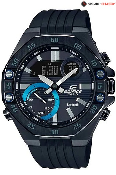Кварцевые наручные часы Casio ECB-10PB-1A коллекции Edifice с технологией Bluetooth®. Калибр механизма — 5618. С помощью Bluetooth® вы можете подключить часы к смартфону и получить доступ к полезным функциям. Часы автоматически связываются с телефоном через Bluetooth® и проверяют точность времени 4 раза в сутки. Возможности Bluetooth в данной модели: С помощью специального приложения EDIFICE Connected возможно установить время в конкретном городе (300 городов), установить точное текущее время, установить будильник, просмотреть показания секундомера, подстроить положение стрелок. Функция поиска телефона - включение тонового сигнала на телефоне для быстрого поиска. Функциональность данной модели: индикация даты и дня недели (в том числе на Русском языке); мировое время в 38 городах (38 часовых поясов); вечный календарь до 2099 года; 5 независимых будильников и сигнал начала часа; секундомер с точностью 1/1000 сек. и измерением до 23 часов 59 минут 59 cек.; таймер обратного отсчета (диапазон времени 24 часа); двойная диодная подсветка циферблата с функцией авто (включается при наклоне часов на 40°) и возможностью выбора времени свечения (1.5 или 3 секунды) + необритовое (Neobrite) покрытие на стрелках и метках для длительного послесвечения в темноте; функция перемещения стрелок (помогает определить значения в окошках с цифровой индикацией, когда стрелки их закрывают); функция выключения звука нажатия кнопок; режим полёта (авиарежим). На корпус нанесено стойкое PVD покрытие. Полимерный ремешок. Водонепроницаемость WR100 (10 атм).